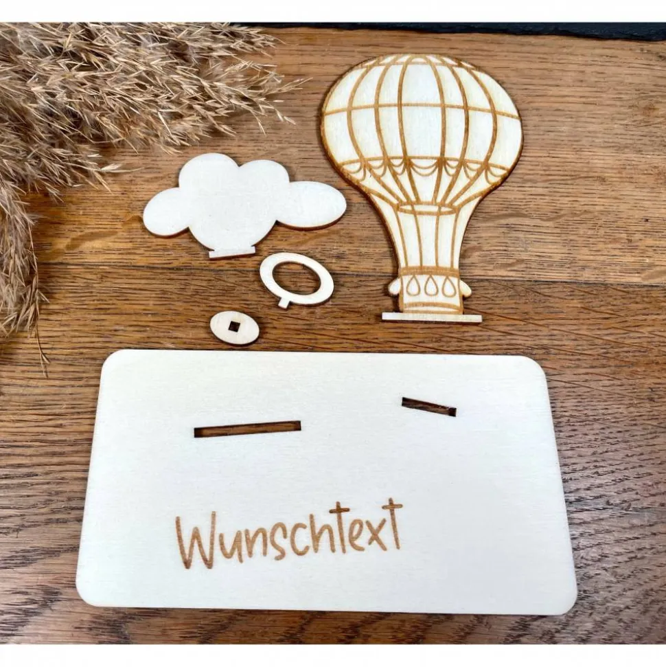 Verschenke Leichtigkeit und Abenteuer! Dieser aus Holz gefertigte Heißluftballon ist eine besondere und kreative Möglichkeit, einen Geldschein zu verschenken. Er steht für Freiheit, Träume und neue Perspektiven. Liebevoll gestaltet und detailreich gearbeitet, ist er ein wunderschönes Geschenk für Reisefans, Romantiker oder besondere Anlässe.