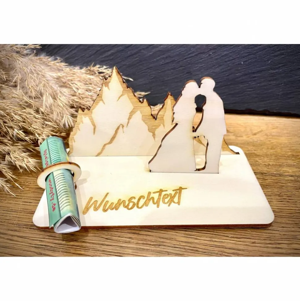 Ein Geschenk voller Liebe und Fernweh! Dieses aus Holz gefertigte Hochzeitspaar mit Bergen als Hintergrund ist eine besondere und stilvolle Möglichkeit, einen Geldschein zu verschenken. Es symbolisiert gemeinsame Wege, Abenteuer und eine Zukunft voller Höhen und Glücksmomente. Liebevoll gestaltet, ist es perfekt für naturverbundene Paare.