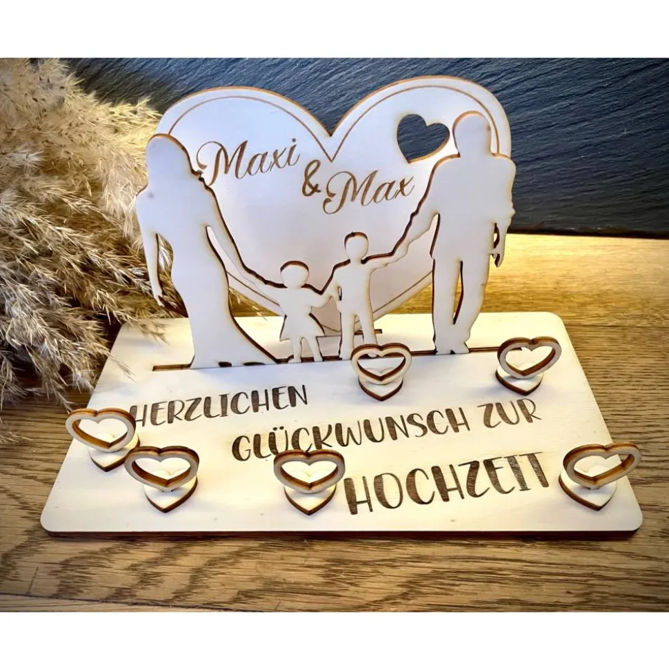 Ein Geschenk für die ganze Familie! Dieses aus Holz gefertigte Hochzeitspaar mit Kindern ist eine liebevolle Möglichkeit, einen Geldschein zur Hochzeit zu verschenken. Es symbolisiert Zusammenhalt, Liebe und den gemeinsamen Weg als Familie. Mit viel Liebe zum Detail gestaltet, ist es ein persönliches und emotionales Geschenk, das lange in Erinnerung bleibt.