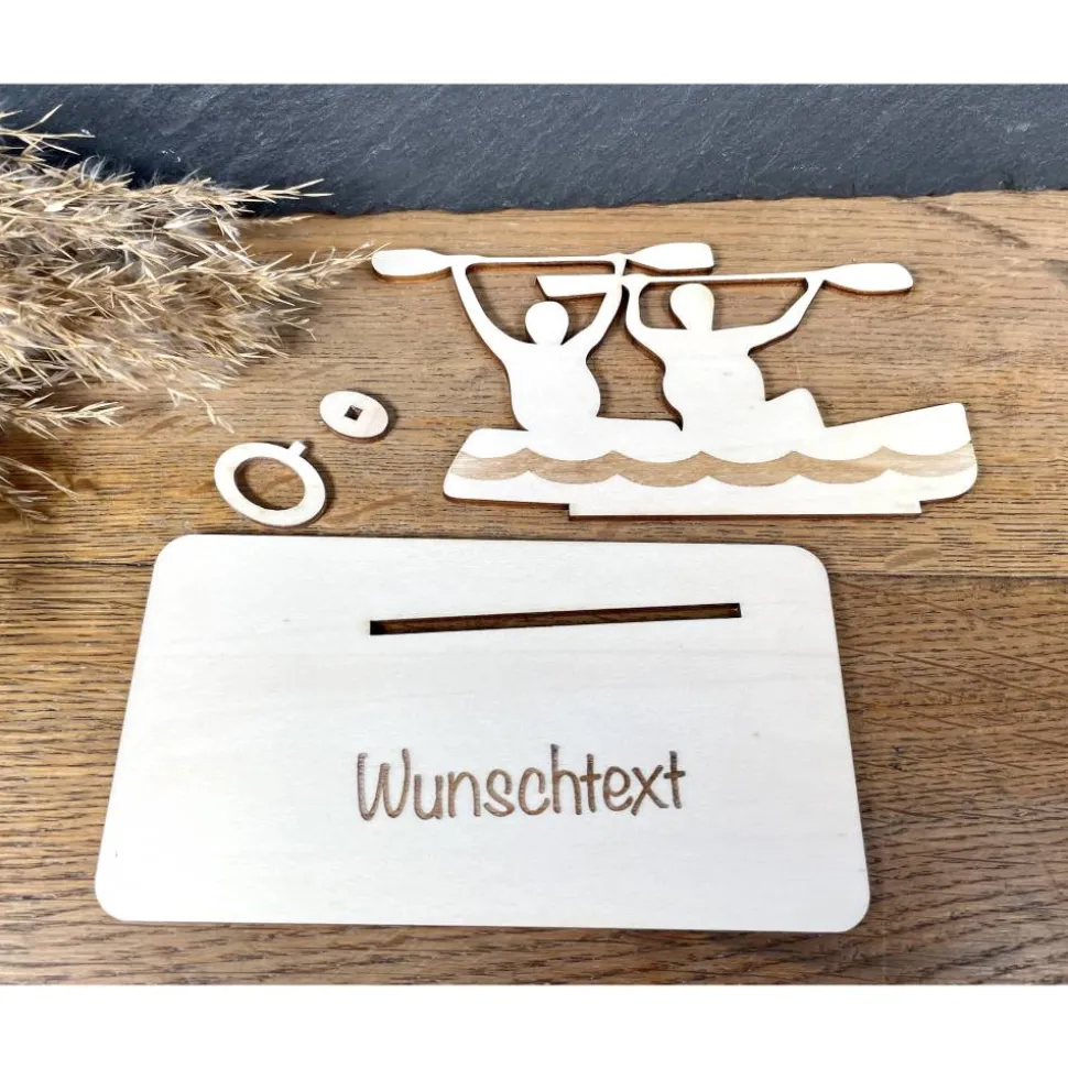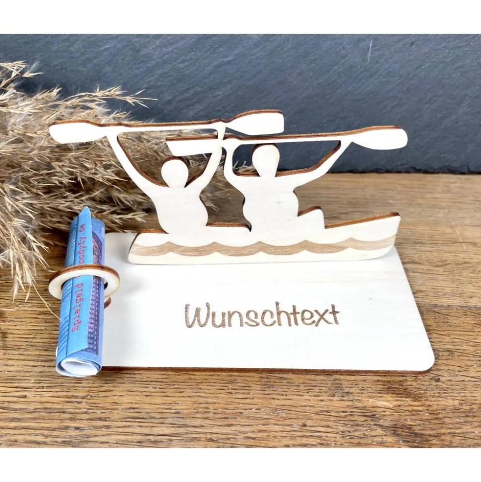 Für Abenteurer und Naturliebhaber! Dieses aus Holz gefertigte Kanu mit zwei Personen ist eine besondere und liebevolle Möglichkeit, einen Geldschein zu verschenken. Es steht für gemeinsame Erlebnisse, Ruhe auf dem Wasser und Zeit zu zweit. Mit viel Liebe zum Detail gestaltet, ist es ein persönliches Geschenk für Paare oder Outdoorfans.