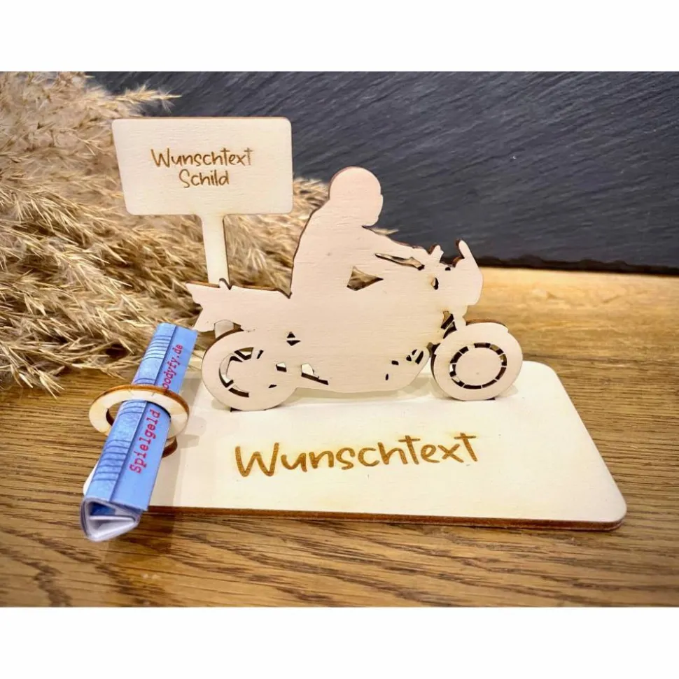 Für alle, die die Freiheit auf zwei Rädern lieben! Mit diesem detailreichen Motorrad aus Holz verschenkst du echte Begeisterung. Ob als Zuschuss für die nächste Tour, neue Schutzkleidung oder einfach als Finanzspritze für das Hobby – klemm den Geldschein einfach ein und mache jedem Motorradfahrer eine riesige Freude.
