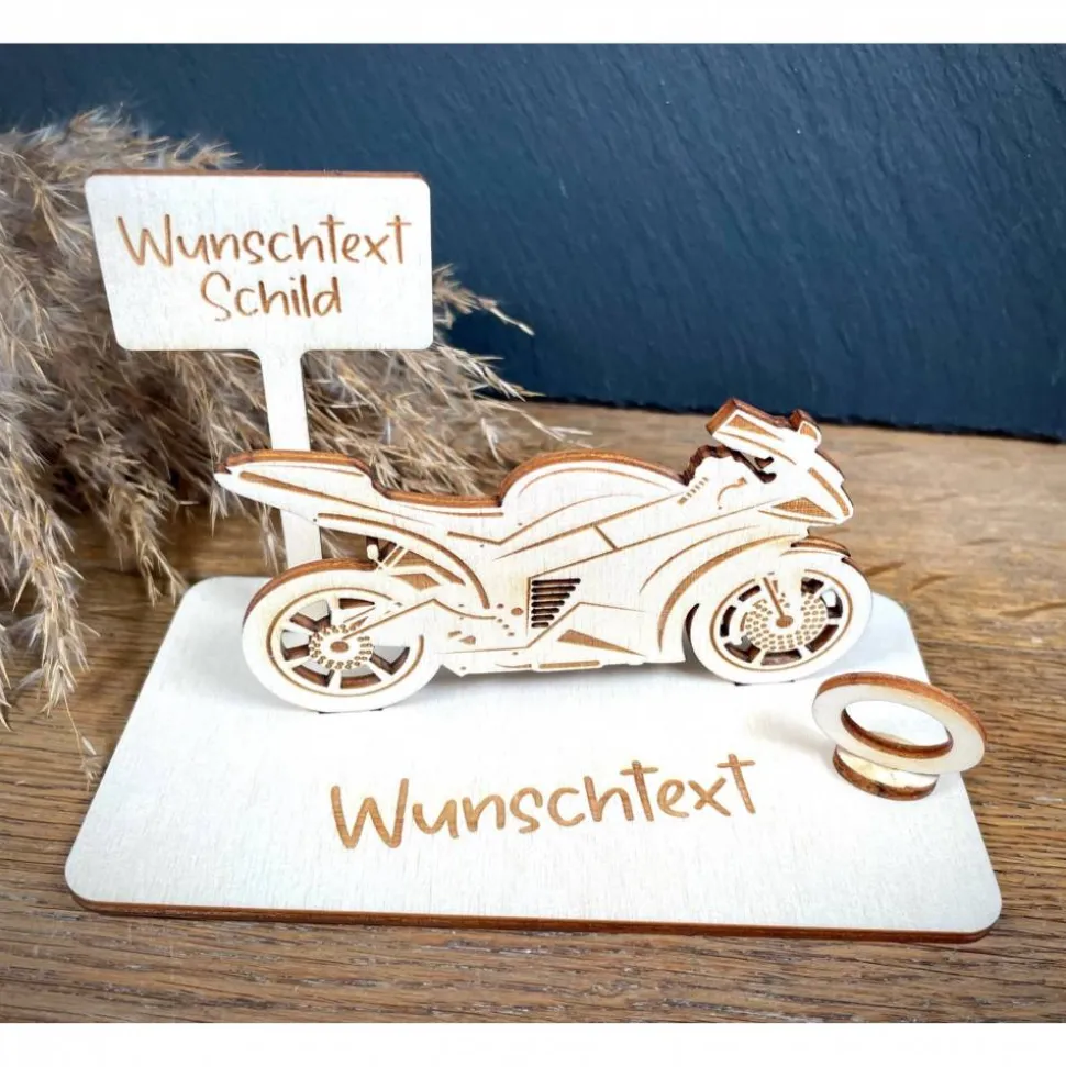 Du suchst das perfekte Geschenk für echte Adrenalin-Junkies? Diese detailreiche Motorrad-Rennmaschine aus Holz ist die stilvollste Art, Vollgas beim Schenken zu geben! Einfach den Geldschein rollen, in den Geldring schieben und schon wird aus einer Finanzspritze ein echtes Deko-Highlight. Ein hochwertiges Unikat für Geburtstage oder den Führerschein. Fahr los und bereite Freude!
