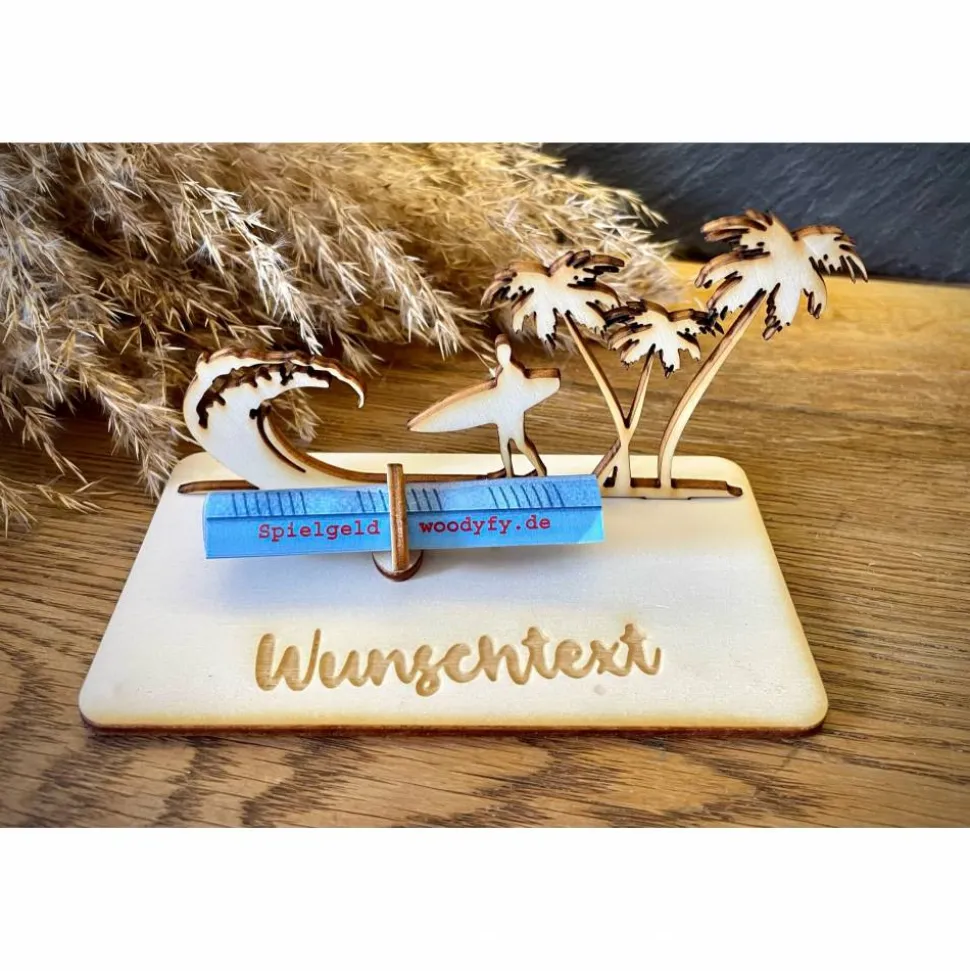 Der Geldscheinhalter besteht aus mehreren Teilen, die zusammengesteckt und verklebt werden. Der Geldscheinhalter kann mit Acrylfarben oder Poscastiften bemalt werden.