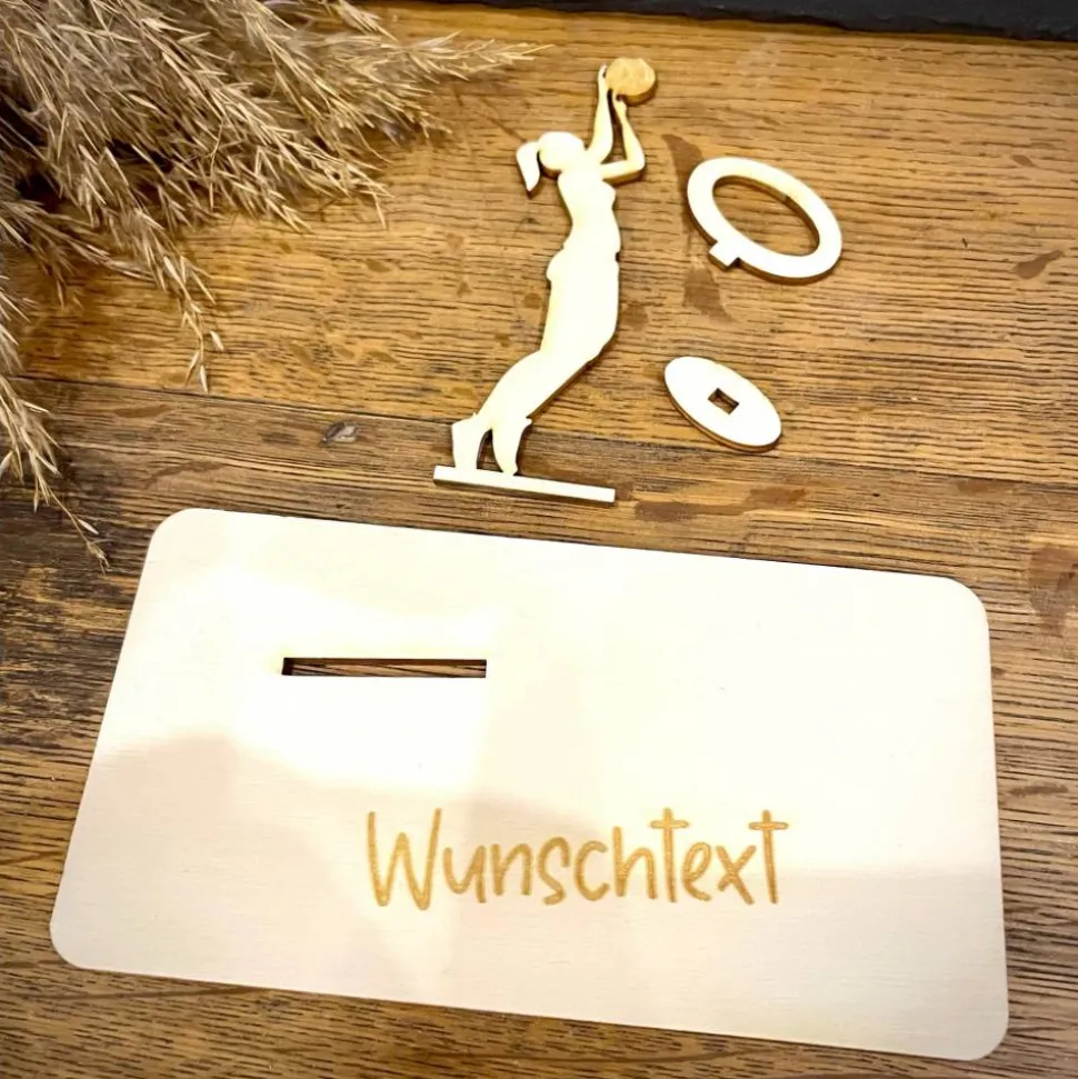 Der Geldscheinhalter besteht aus mehreren Teilen, die zusammengesteckt und verklebt werden. Der Geldscheinhalter kann mit Acrylfarben oder Poscastiften bemalt werden.