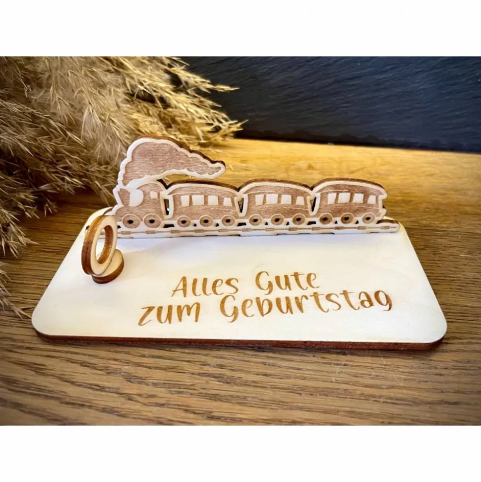 Verschenke Reiselust auf besondere Art! Dieser aus Holz gefertigte Zug ist eine kreative Möglichkeit, einen Geldschein zu verschenken. Ideal für Bahnliebhaber, Reisefans oder neue Lebensabschnitte. Das liebevoll gestaltete Design steht für Aufbruch, Abenteuer und neue Wege – ein Geschenk mit Symbolkraft und ganz viel Charme.