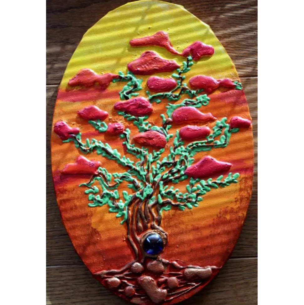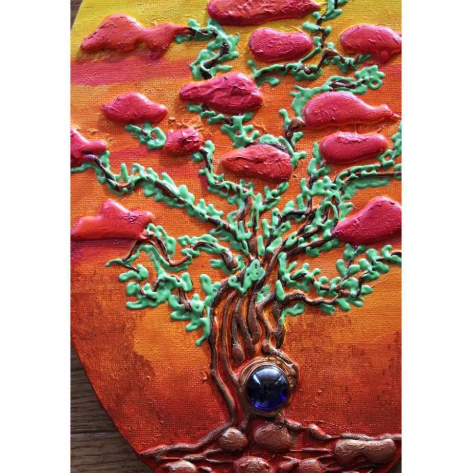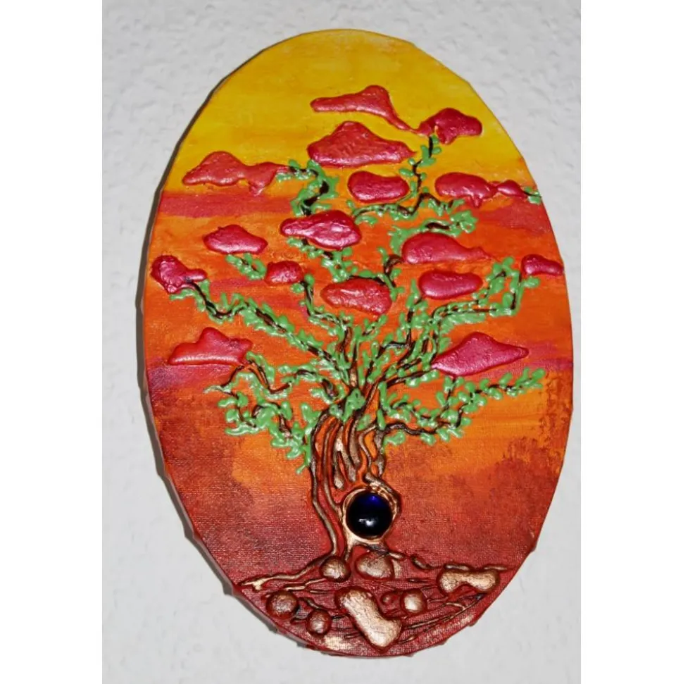 Zauberhaftes Acrylbild auf einem ovalen Keilrahmen in leuchtenden Farben. Schöne Effekte durch die Verwendung von Spachtelmasse und metallisch glänzende Farben. Dekoriert mit einem kleinen Glasstein.