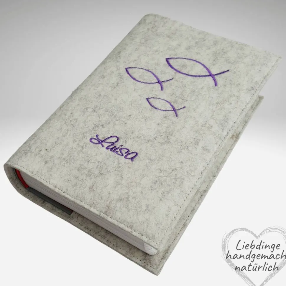 lila Stickerei: Fische und Name auf dem cover in Schreibschrift