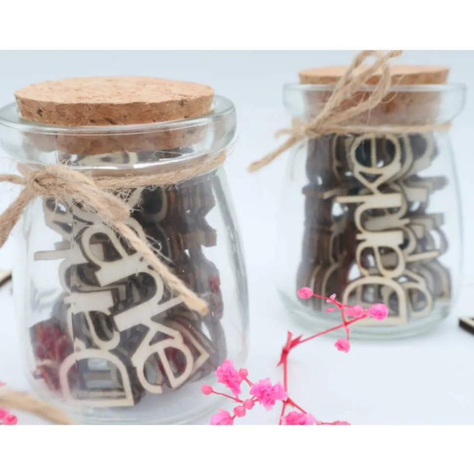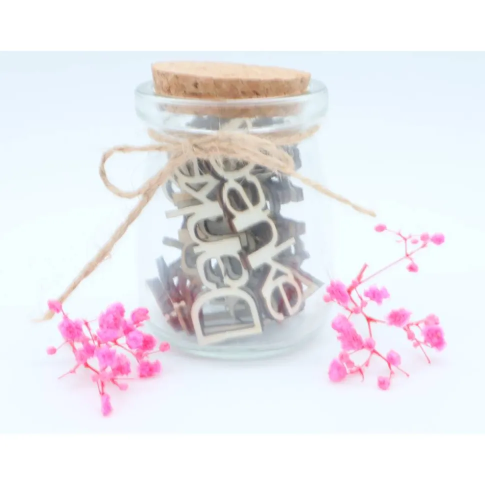 Dieses einzigartige Geschenkglas verfügt über aus Holz ausgeschnittene Worte „DANKE“.