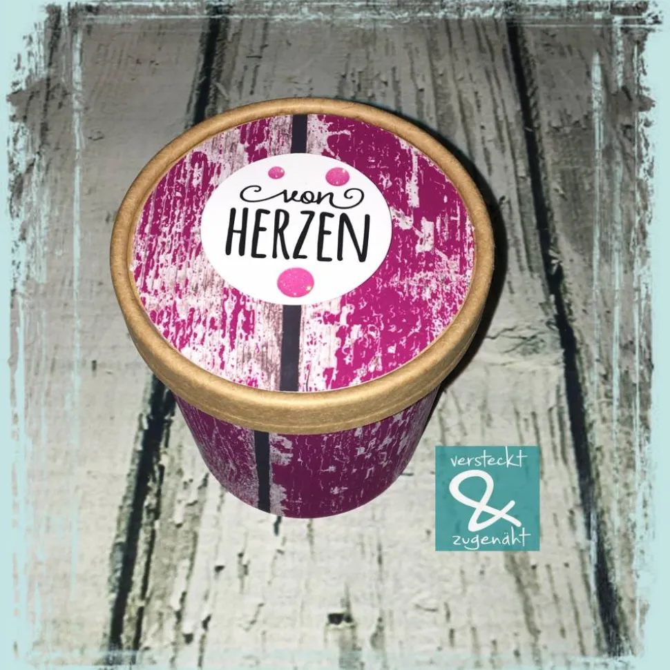 Ursprünglich waren das Suppenbecher to go, Eine Banderole um den Becher und der Kreis auf den Deckel wurden von mir gedruckt, geschnitten und aufgeklebt. Das Design ist von Kleine Göhre (