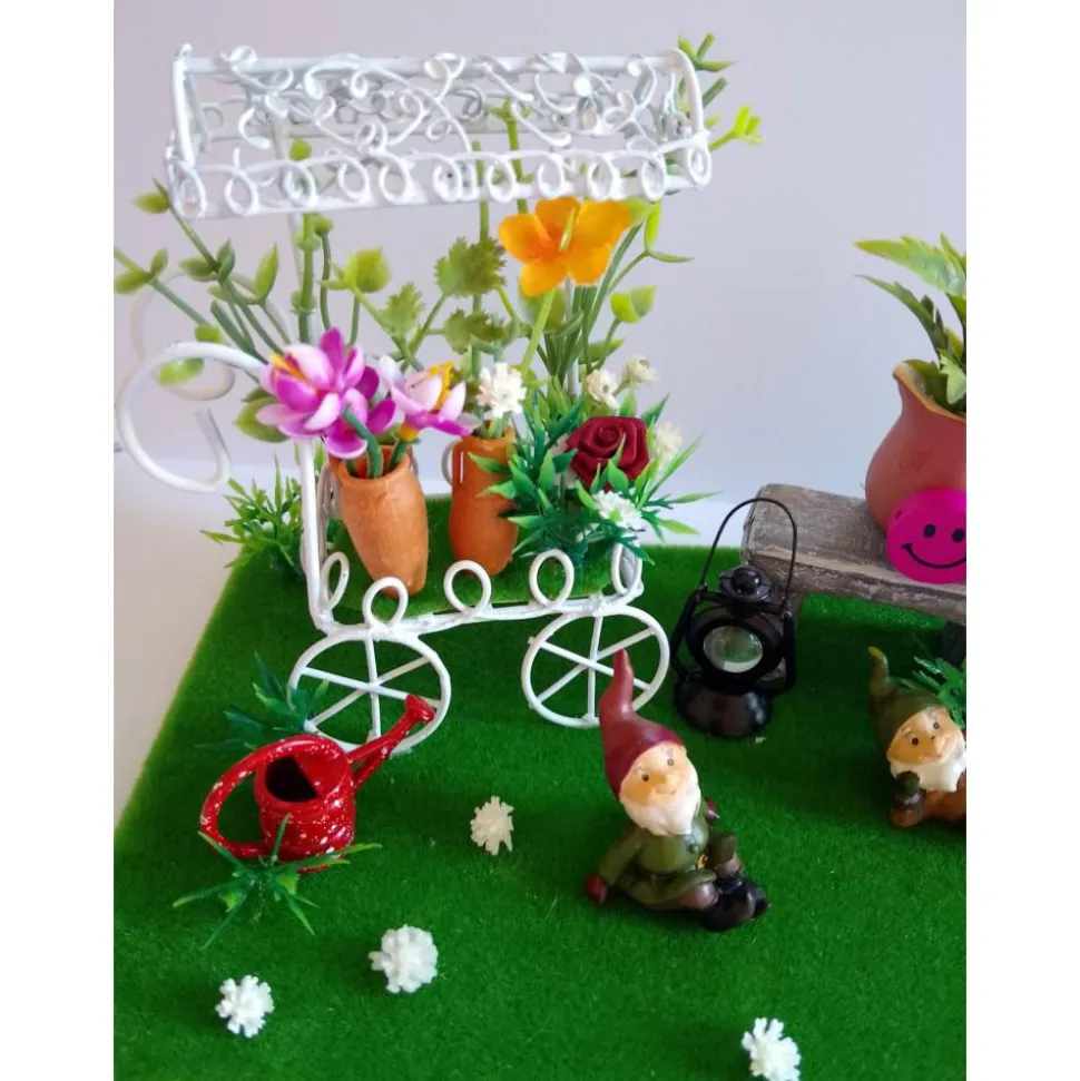 Im Mittelpunkt der Szene steht der Blumenwagen , in der Art eines Marktkarrens… dann eine Bank mit Blumentopf dekoriert , Gießkanne und zwei kleinen Zwergen….so ist die Szene perfekt gestaltet . Die Szene ist auf einer Platte von 13 x 18 cm mit einer Höhe von ca. 14 cm arrangiert und eignet sich perfekt als Geschenk zum Geburtstag, Hochzeitstag, Jubiläum oder als besondere Überraschung.