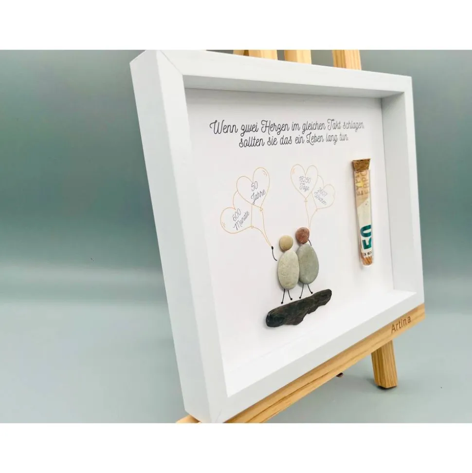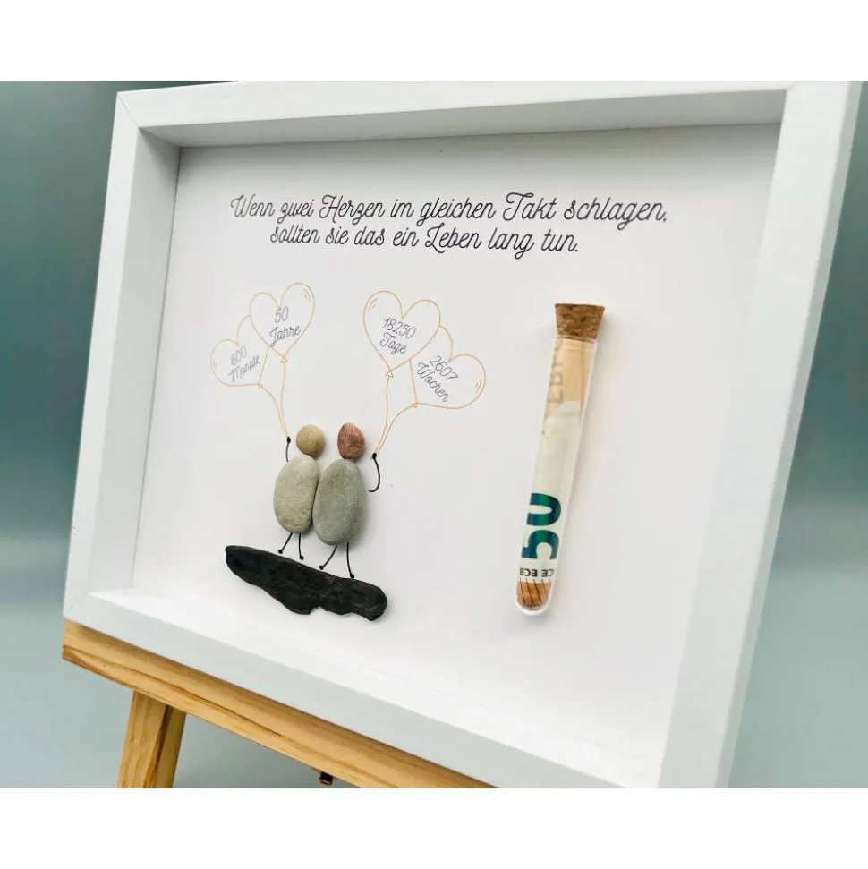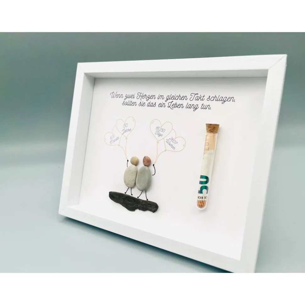 Bist du auf der Suche nach einem einmaligen Geschenk? Dann wirst du dieses Custom Bild aus Steinen und Treibholz lieben! Die Bilder sind echte Blickfänger und visuelle Highlights, die jedem Zimmer eine besondere Atmosphäre und den letzten Schliff verleihen. Die Materialien für das Bild werden von Hand gesammelt und angeordnet, was jedes Bild zu einem echten Unikat macht! Perfekt, um deinen Lieben eine besondere Freude zur goldenen Hochzeit zu machen. Also, worauf wartest Du noch? Lass uns jetzt deine Personalisierungswünsche wissen und wir kreieren dein einmaliges Bild für dich!
