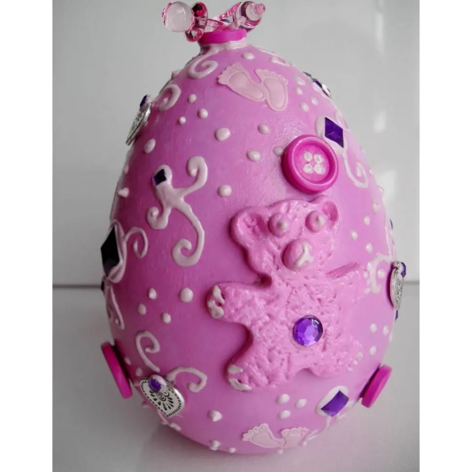 Verwendete Materialien: Acrylfarben auf einem Keramik-Ei, Dekoelemente.
