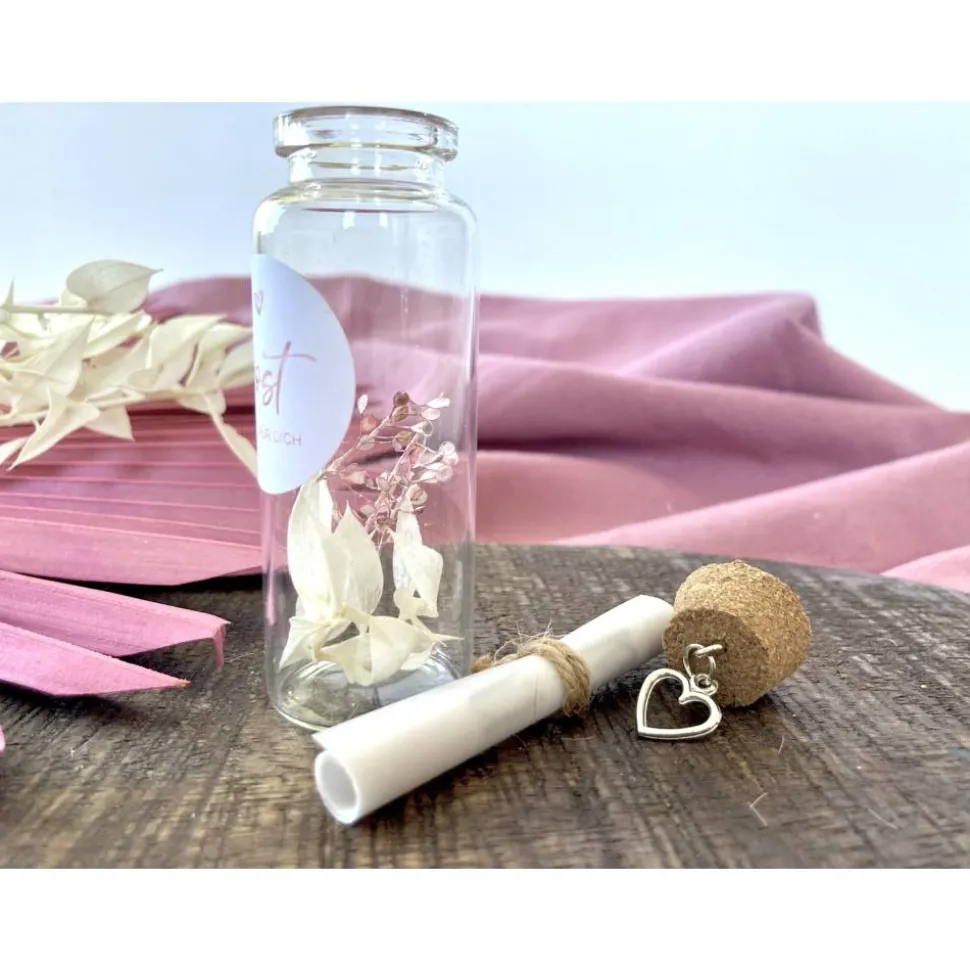 Sie ist aus Glas und hat einen Korkverschluss in dem ein kleiner Herzanhänger steckt.