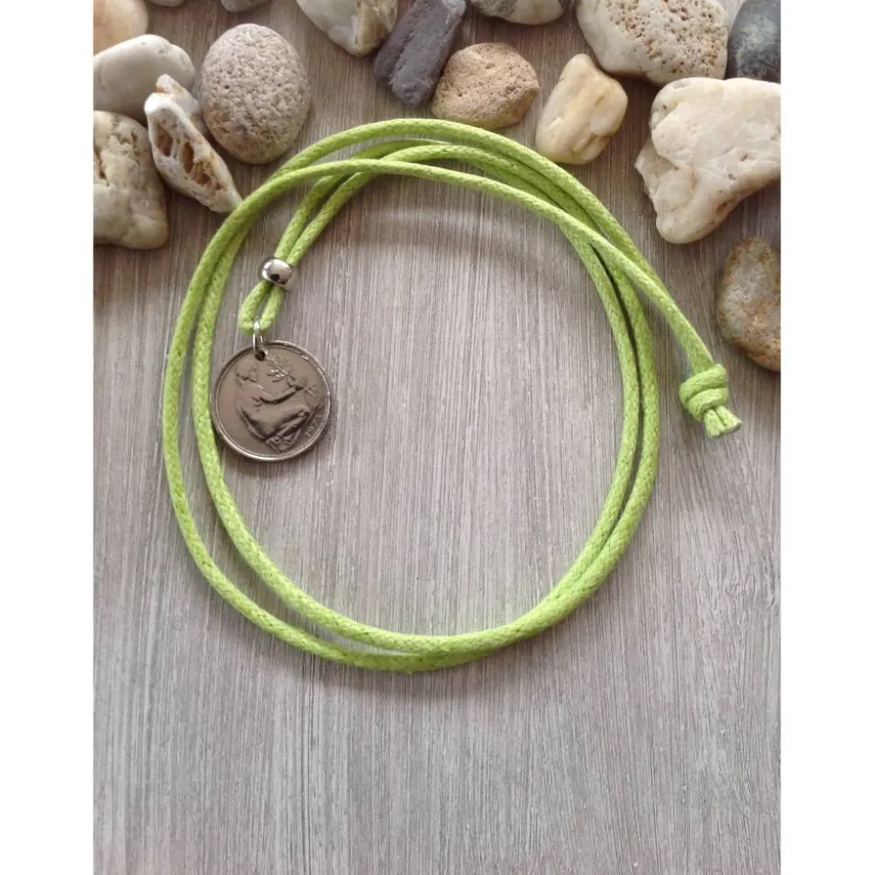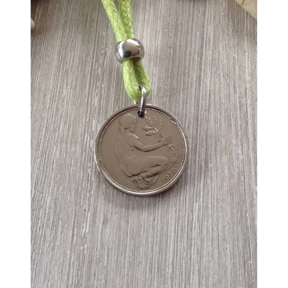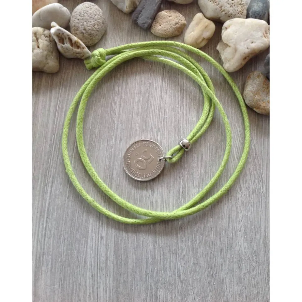 Ein 50-Pfennig-Stück von 1973 wurde durchbohrt und die Bohrung entgratet. Die Münze ist mit einer Edelstahlöse an der Kette befestigt. Da die Münze aus dem Umlauf stammt kann sie kleine Kratzer, Macken und Flecken aufweisen.Die Kette ist aus grünem, gewachstem Baumwollband ( 2mm stark ) und 70 cm lang ( ohne Knoten und Perle gemessen ).