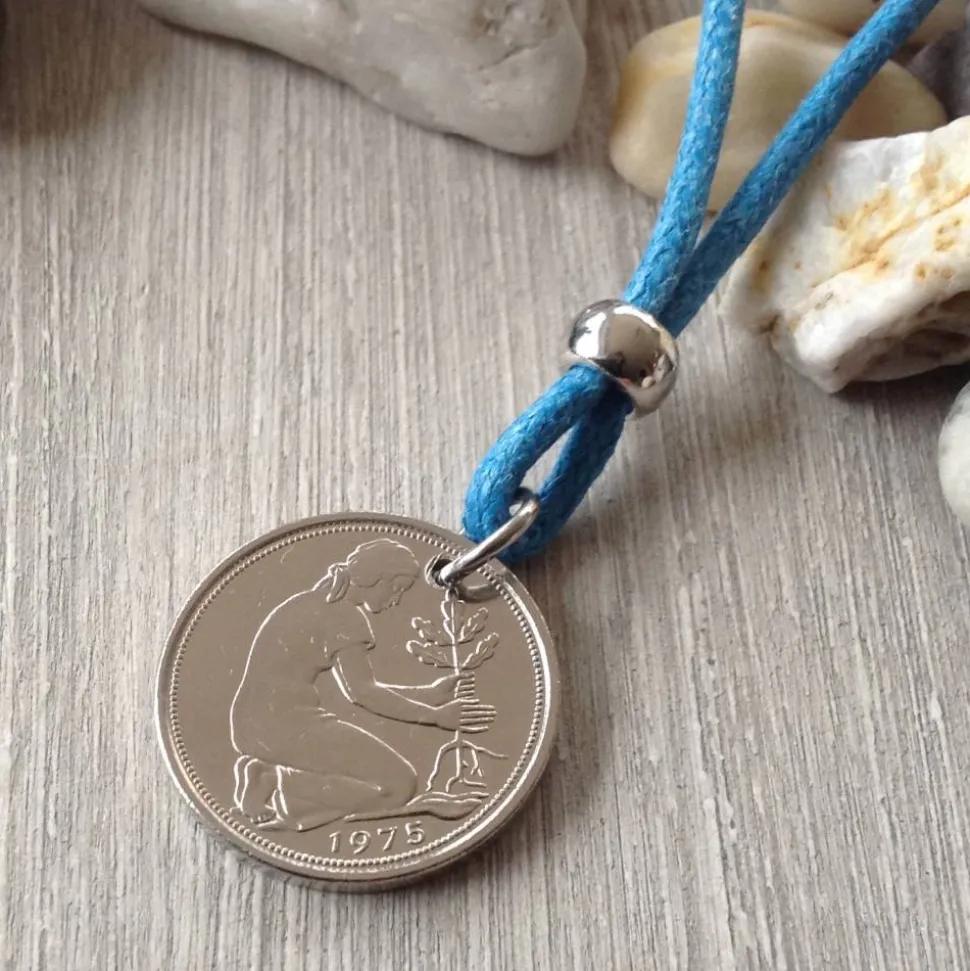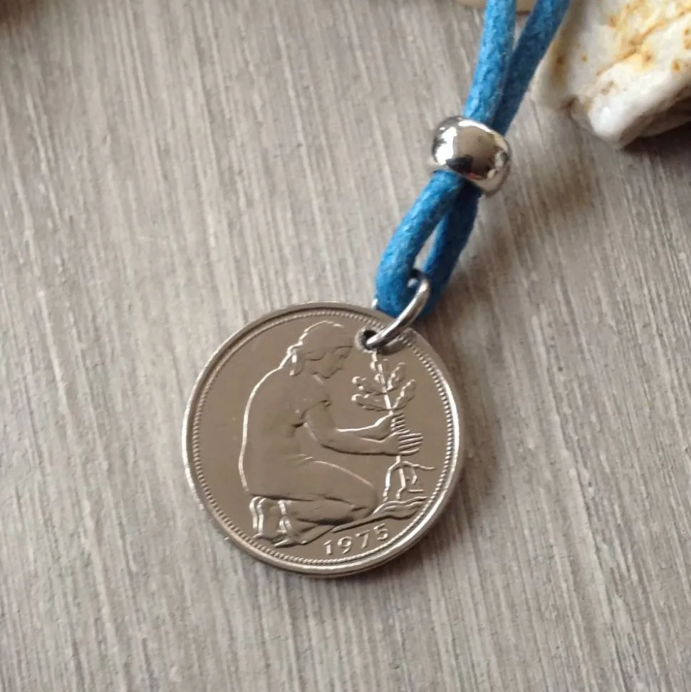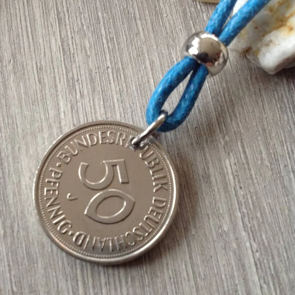 Ein gut erhaltenes 50-Pfennig-Stück von 1975 wurde durchbohrt und die Bohrung entgratet. Die Münze ist mit einer Edelstahlöse an der Kette befestigt. Die Kette ist aus blauer, gewachster Baumwollschnur ( ca 1,5 mm stark ) und 90 cm lang ( ohne Knoten und Perle gemessen ).