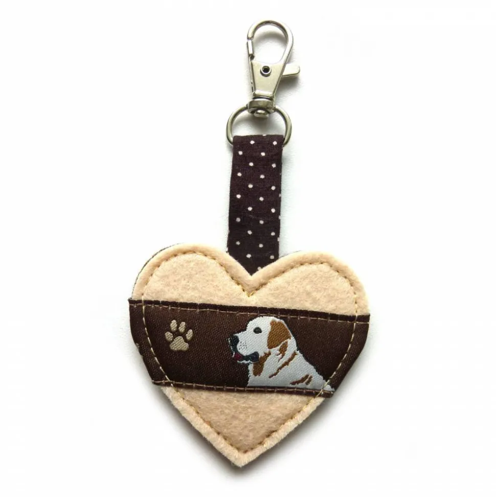 1 Herz-Anhänger aus doppelt verarbeitetem Filz in beige (Vorderseite) und dunkelbraun (Rückseite) mit einem aufgenähten Webband mit Golden Retriever und Pfotenabdrücken.