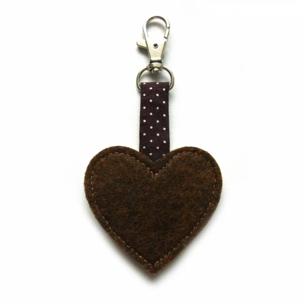 Der Anhänger hängt mit einem braunen Baumwollstoff mit weißen Pünktchen an einem Karabiner.