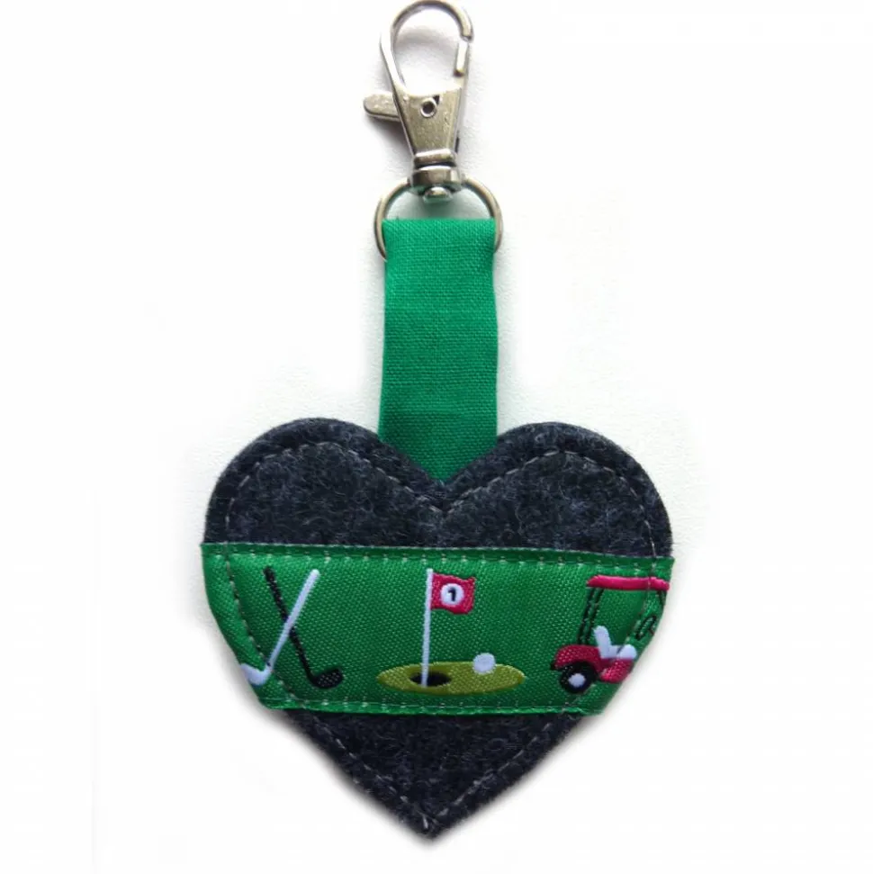 1 Herz-Anhänger aus doppelt verarbeitetem Filz in dunkelgrau mit einem aufgenähten Webband mit Golf-Motiven (Golfschläger, hole in one, Caddy).