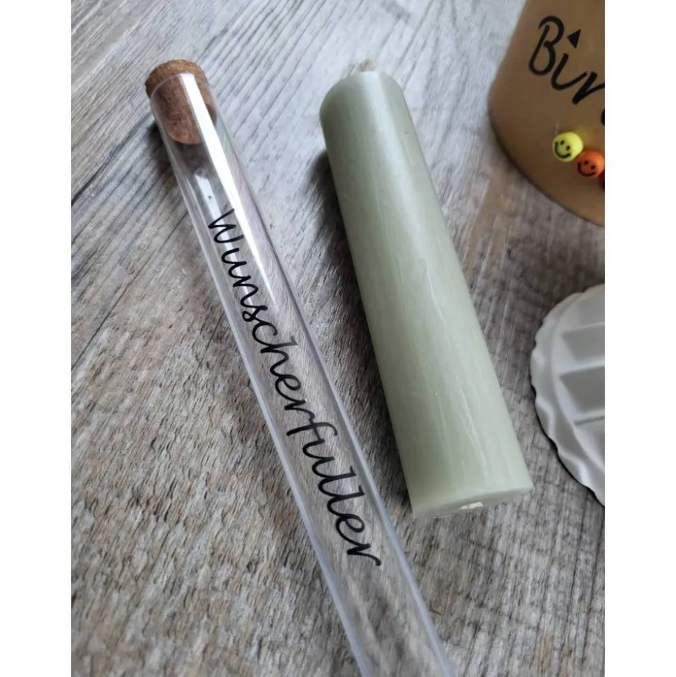 Dieses Set besteht aus einer salbeifarbenen Kerze, einem Gugelhupf-Kerzenhalter gegossen aus Reliefgießpulver und einem Reagenzglas mit Korken und der Aufschrift Wunscherfüller für ein Geldgeschenk.