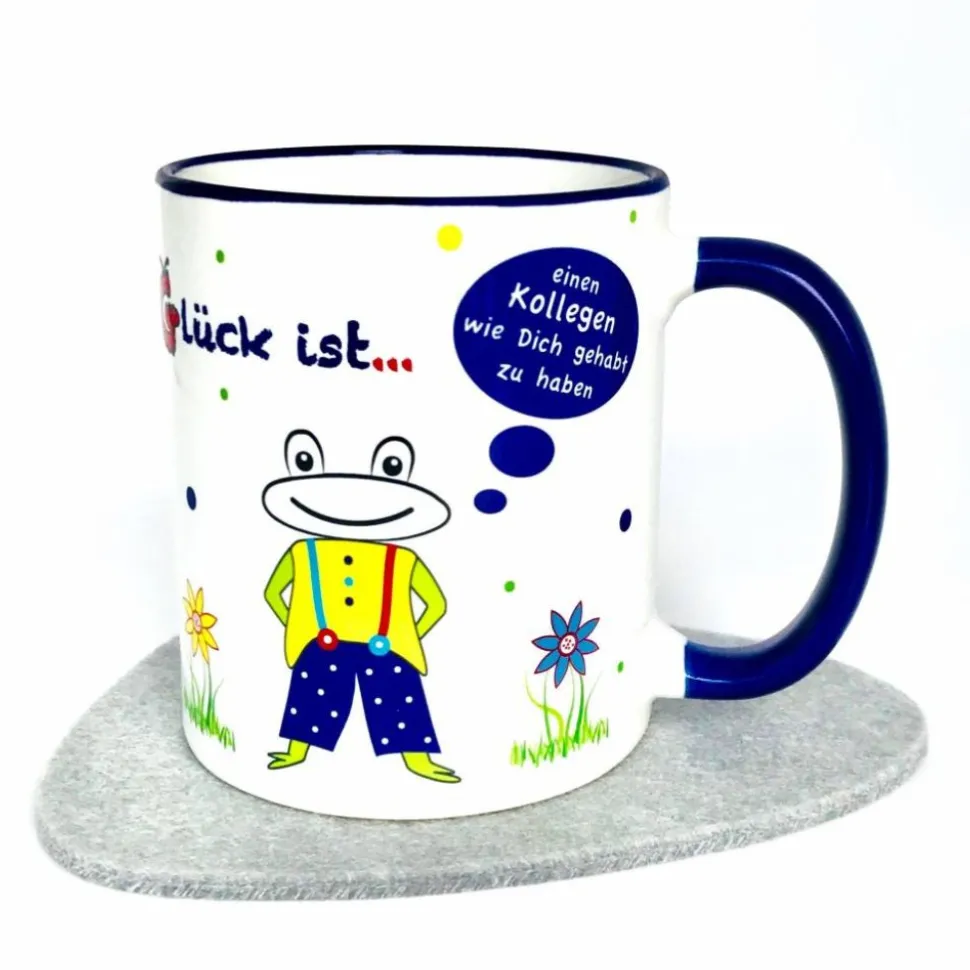 Die fröhlich bedruckte Tasse mit Spruch „Glück ist einen Kollegen wie dich gehabt zu haben“ eignet sich hervorragend als Geschenk wenn der Kollege in Rente geht oder den Job wechselt.