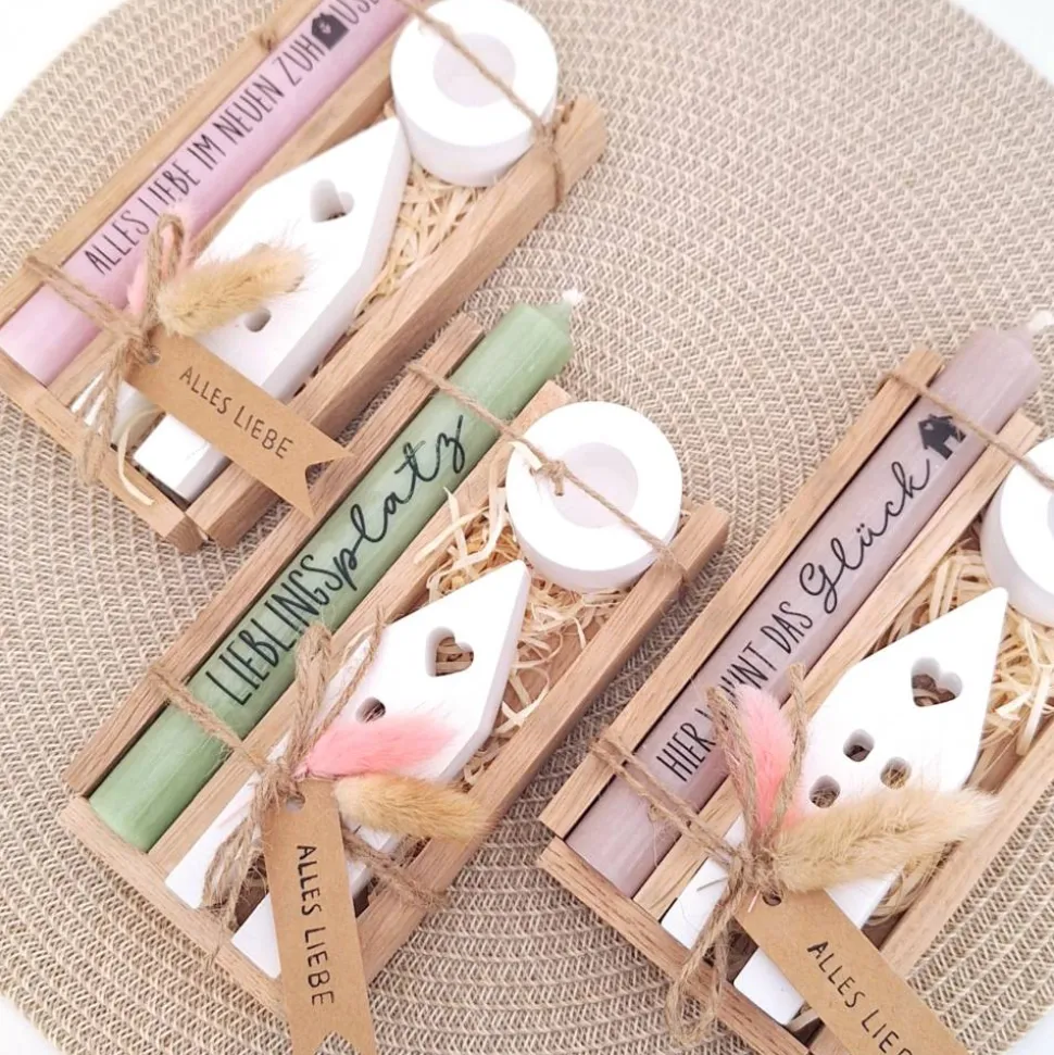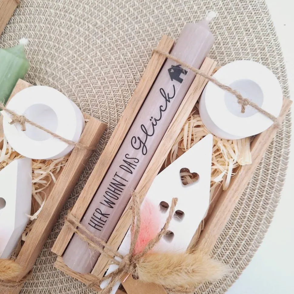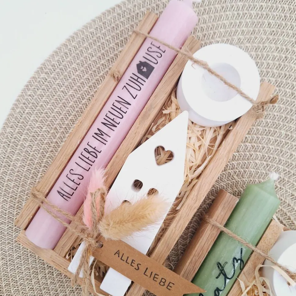 Das Kerzenset besteht aus einer Kerze (in der Farbe deiner Wahl) mit einer Aufschrift deiner Wahl, einem passenden runden Kerzenhalter und einem Haus / Lichthaus.