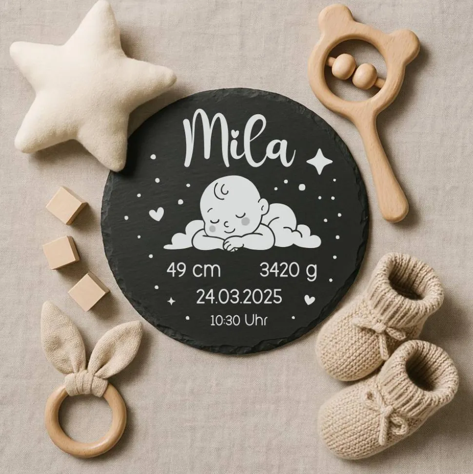 Gefertigt aus echtem Naturschiefer und individuell graviert mit Namen, Geburtsdatum, Uhrzeit, Gewicht und Größe, wird jede Tafel zu einem einzigartigen Erinnerungsstück. Ideal als Geschenk zur Geburt, Taufe oder für das Kinderzimmer.