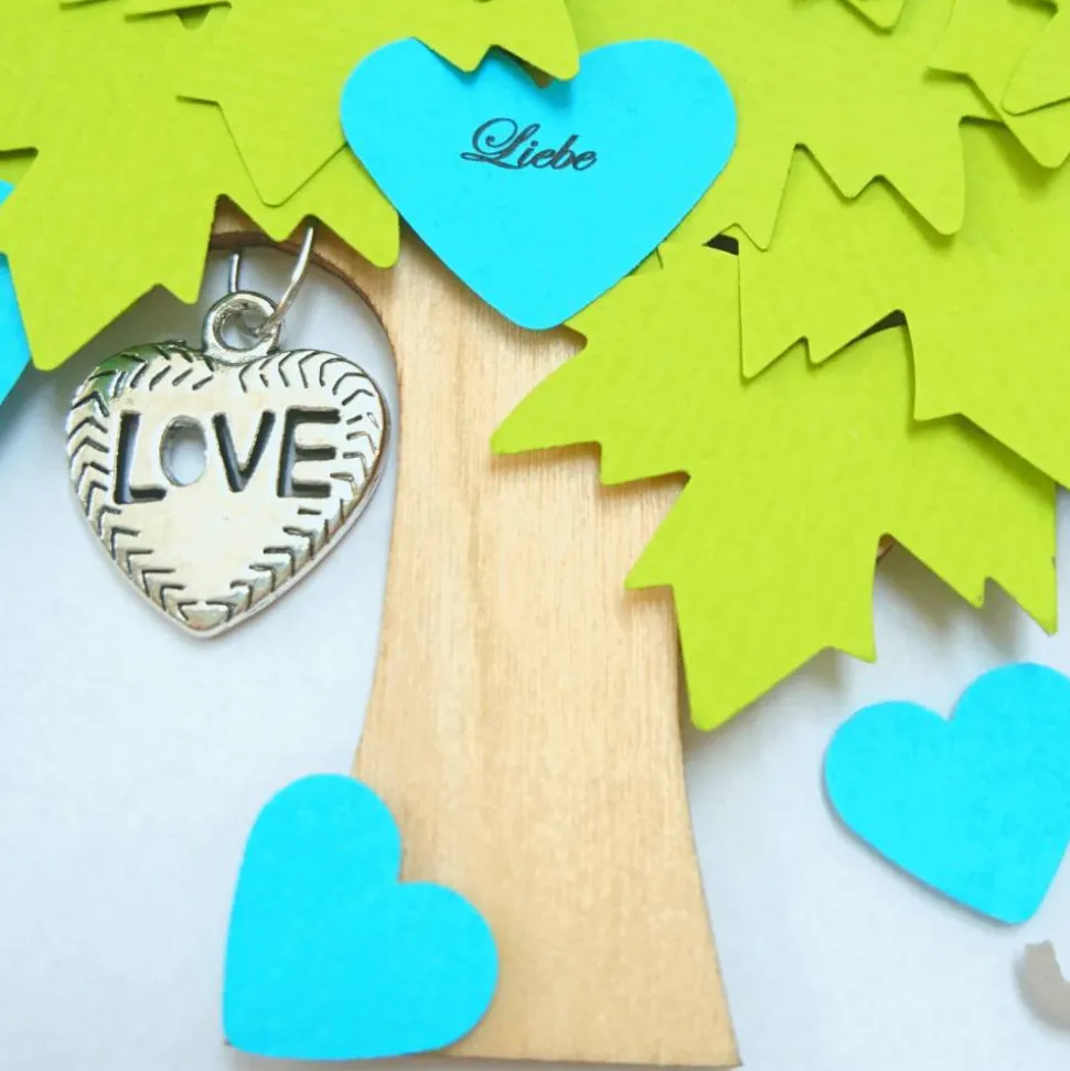 An einem Ast des Baumes hängt ein silberfarbiger Herz-Anhänger mit der Inschrift LOVE.