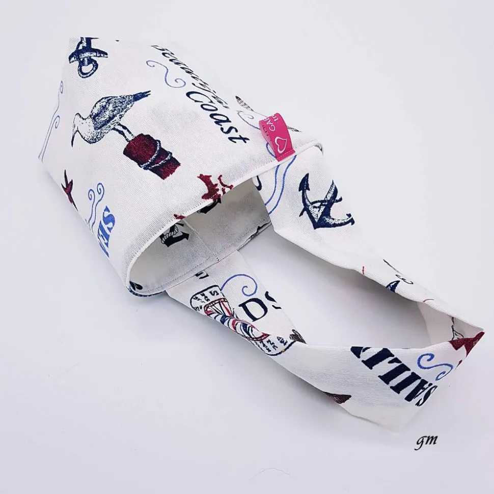 Mit einem 40 cm langen und 6 cm breiten Henkel lässt sich die Stofftasche bequem tragen. Das Design in weiß mit blau und rot ist zeitlos und passt zu jeder Gelegenheit.