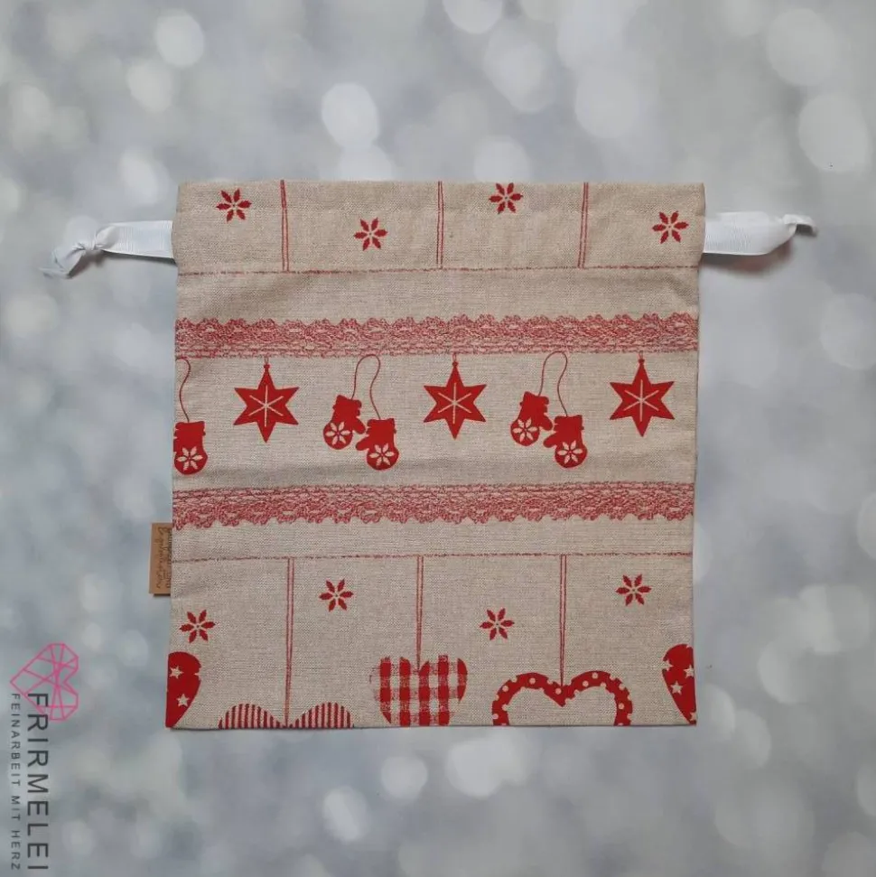 Er hat eine Größe von ca. 30cm x 28cm und ist beidseitig mit einem Band zuzuziehen.