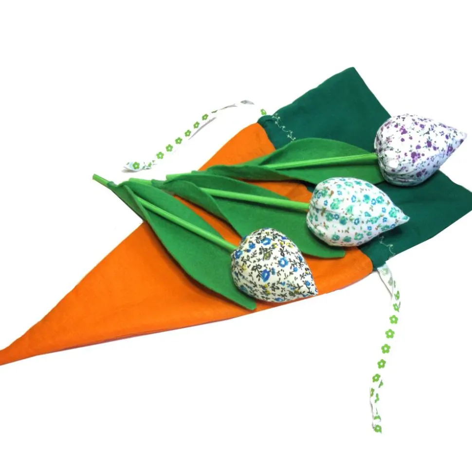 - Inklusive drei handgefertigten Stofftulpen mit Holzstiel, Baumwollblüten und Filzblättern