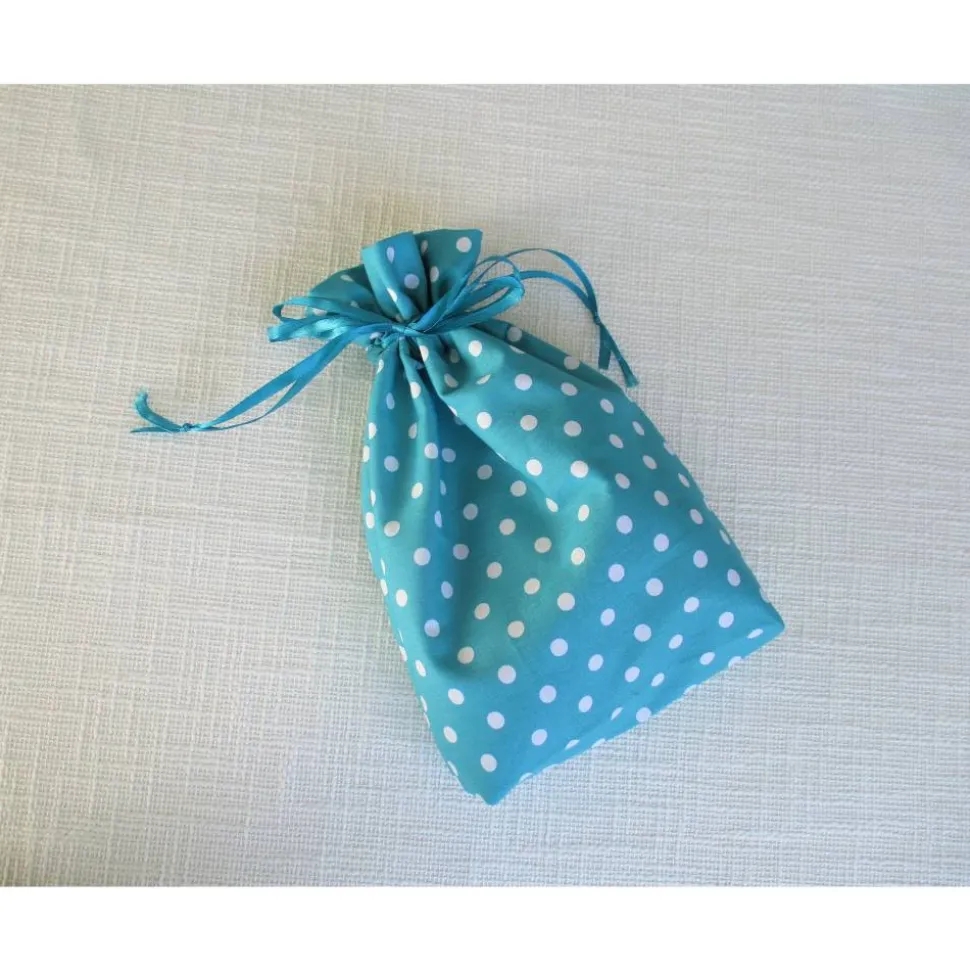 Verwendet habe ich türkisfarbigen Baumwollstoff mit weißen Punkten.