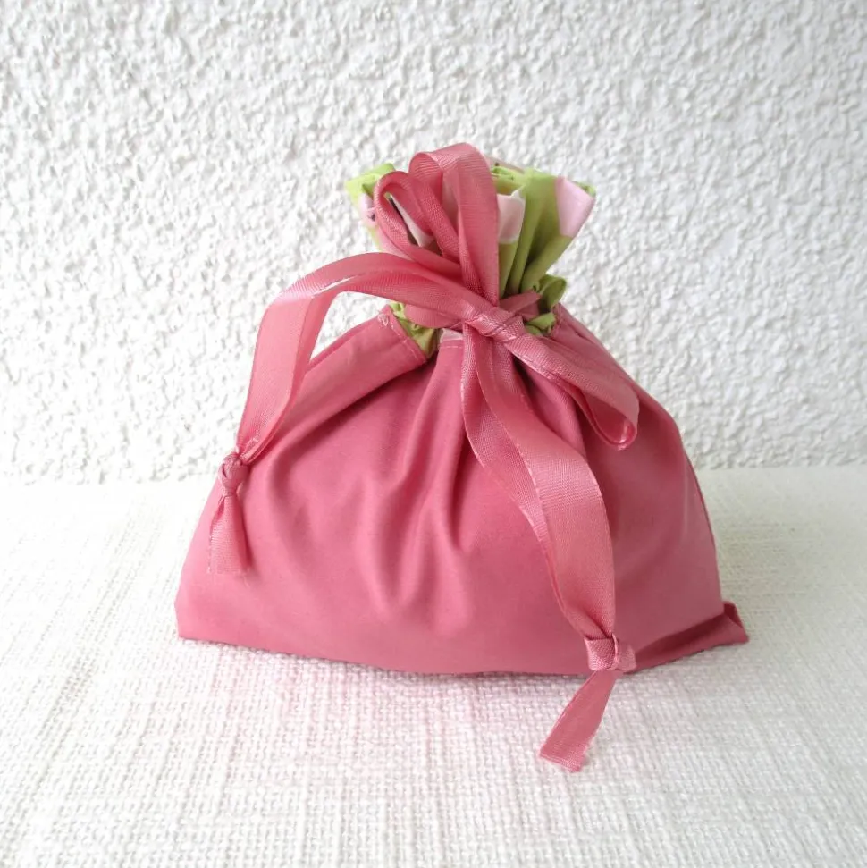 Der Beutel hat einen praktischen Verschluß, er wird mit der rosa Satinkordel einfach zugezogen.