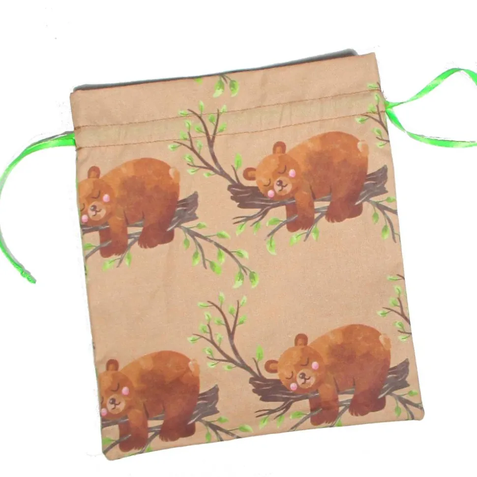 Der kleine Geschenkbeutel ist liebevoll aus Baumwollstoff mit träumenden Bärchen in Beige, Rosa, Grün und Braun genäht. Mit dem praktischen Tunnelzug und den grünen Satinbändern lässt sich der Beutel ganz einfach öffnen und schließen.