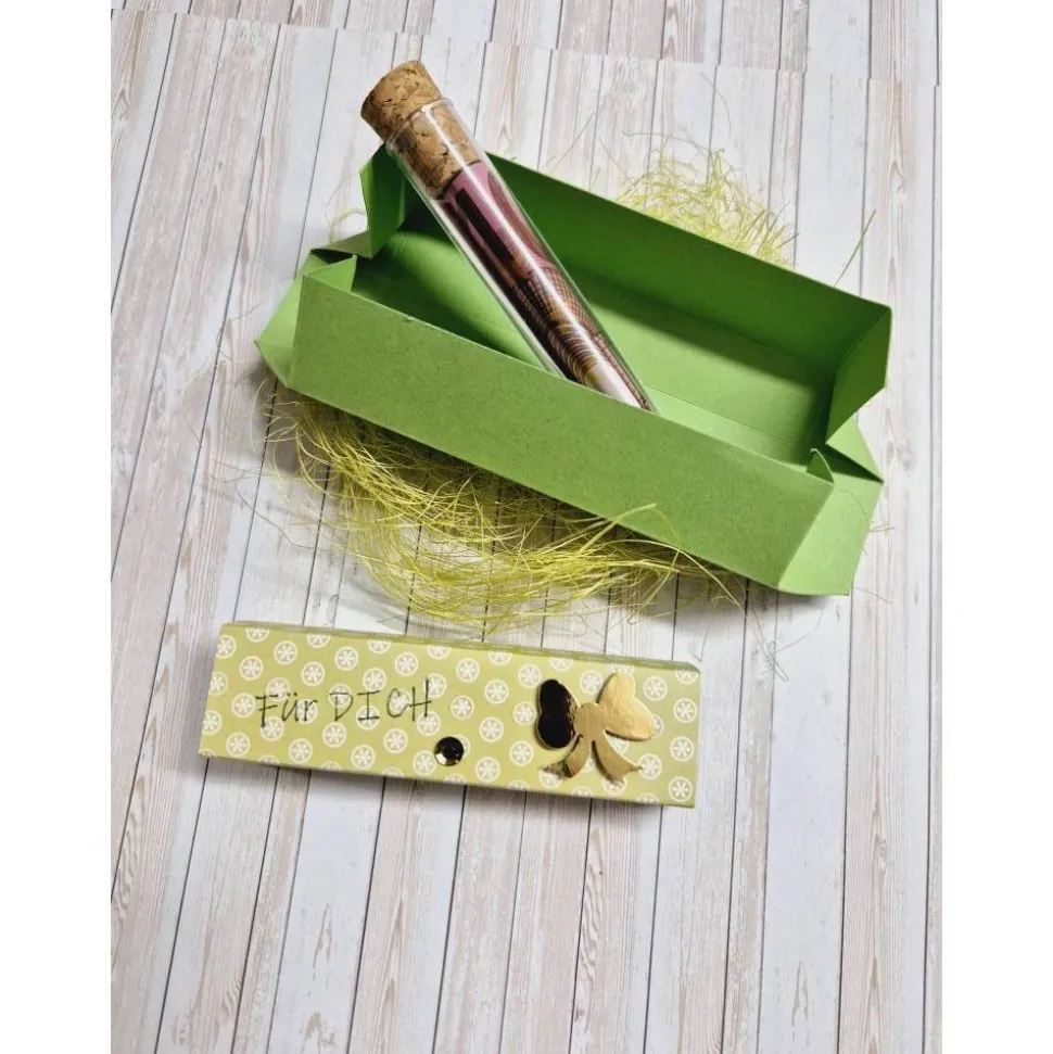 Diese liebevoll handgemachte Geschenkschachtel aus hochwertigem, hellgrünem Tonkarton ist die perfekte Verpackung für Geldgeschenke oder kleine schokoladige Küsschen. Rolle einfach die Geldscheine und stecke sie in das im Angebot enthaltene Reagenzglas. Anschließend verpackst du das Ganze in die dekorative Schachtel und verschließt sie stilvoll mit der verzierten Banderole.
