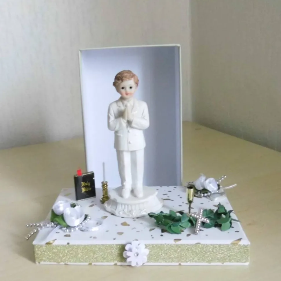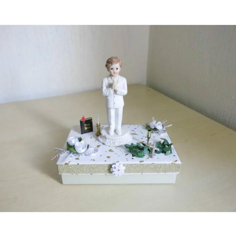 Diese liebevoll gestaltete Geschenkbox eignet sich perfekt für die Kommunion, Konfirmation oder Firmung eines Jungen oder Mädchens. Die dekorative Box ist aufwendig verziert mit einem betenden Jungen, umgeben von zahlreichen Dekoelementen und Blüten. Sie bietet ausreichend Platz für Geldgeschenke, Glückwunschkarten oder kleine Aufmerksamkeiten.