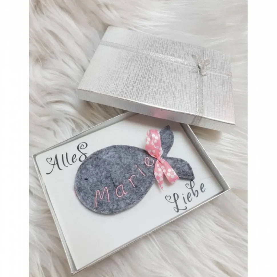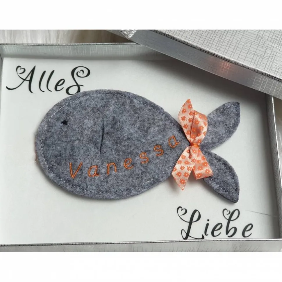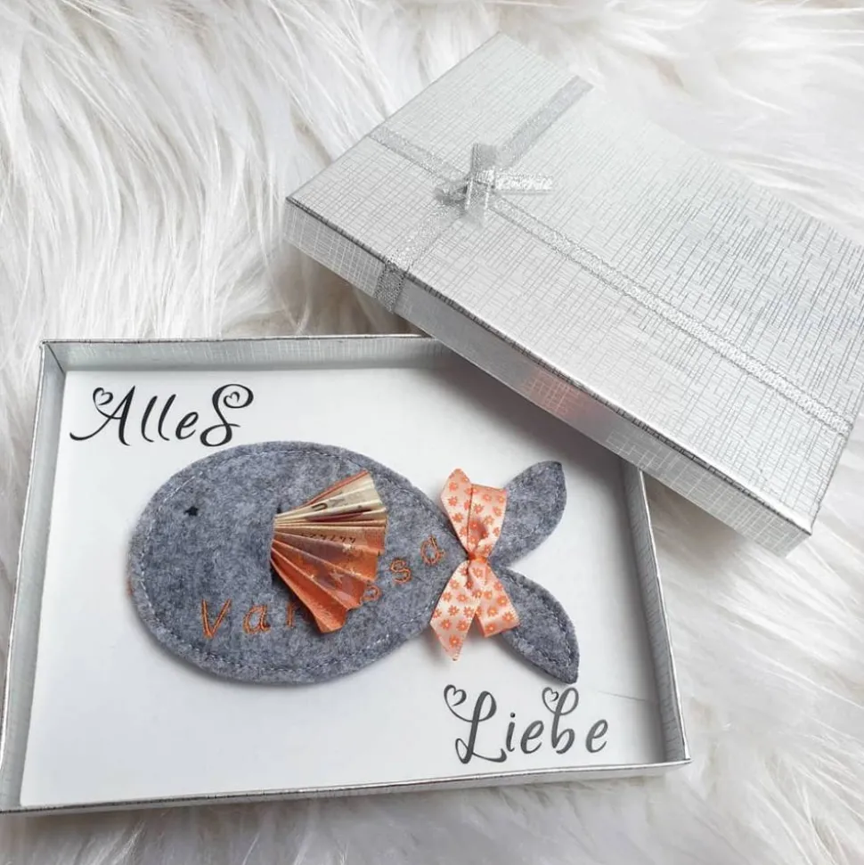 Der Fisch kann mit dem Namen des Beschenkten bestickt werden. Das Geldgeschenk kann in den Schlitz auf dem Fisch eingesteckt werden. Sieht sehr gut aus wenn der Schein in Falten als Flosse eingesteckt wird. Bitte beachten Sie dass für ein Datum kein Platz auf dem Fisch ist und dieses auch nicht Teil des Angebots ist.