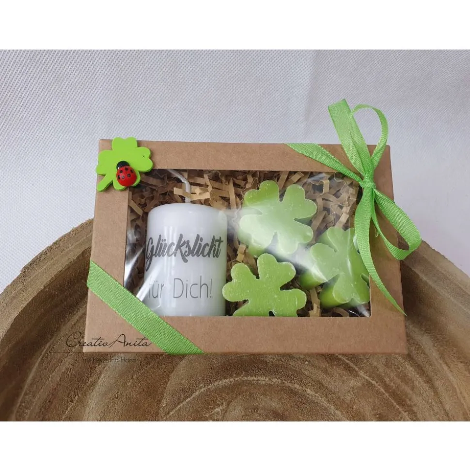 Handverzierte Kerzen mit der Aufschrift „Glückslicht für Dich“ und drei Kleeblätter aus Schafmilchseife.