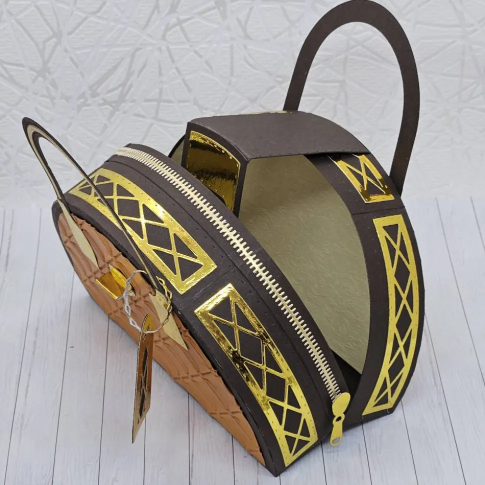 Die Kombination aus warmem Braunton, edlem Gold und den aufwendig gearbeiteten Details macht diese Handtaschen-Geschenkbox zu einem Highlight auf jedem Geschenktisch. Sie ist ideal für festliche Anlässe wie Geburtstage, Jubiläen, Hochzeiten oder Weihnachten und zeigt, wie schön liebevolles Verpacken sein kann.