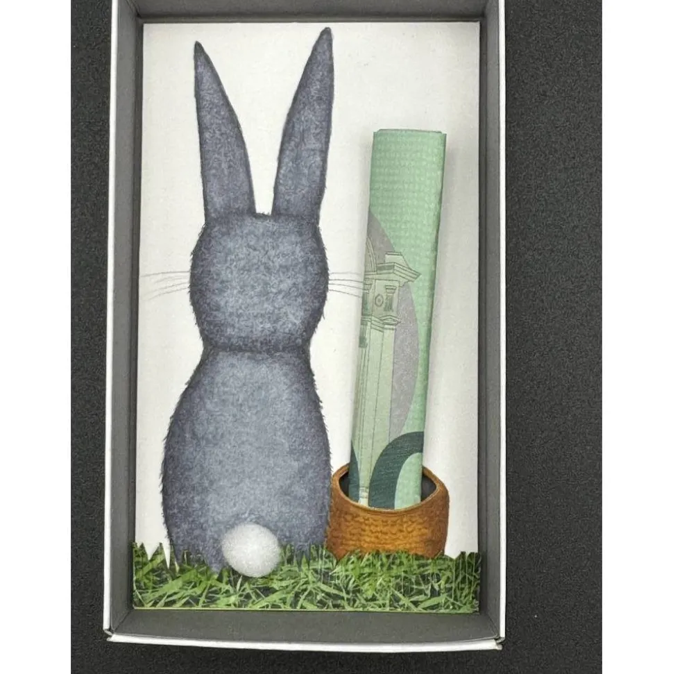 Überrasche zu Ostern mit einer einzigartigen Geschenkbox! Die liebevoll handgemalte Hasenbox ist perfekt für Geldgeschenke oder selbst gestaltete Gutscheine. Im Inneren erwartet dich ein süßer, von hinten gezeichneter Osterhase in Grau mit einem weißen Pompon-Schwänzchen. Neben dem Hasen befindet sich ein Körbchen, in das du einfach einen Geldschein oder Gutschein einrollen, platt drücken und einstecken kannst. Bitte beachte, dass nur ein Schein ins Körbchen passt.
