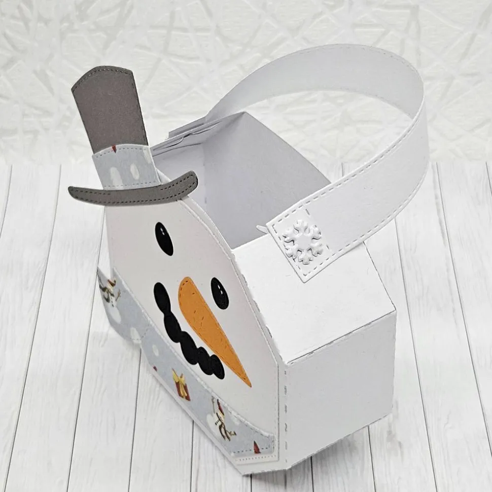 Der Henkel ist dank der Montage mit Flügelklammern beweglich, was das Tragen besonders komfortabel macht. Wenn du die Schneemanntasche individuell dekoriert haben möchtest, kannst du dich jederzeit melden. Gemeinsam besprechen wir, wie deine perfekte Geschenkbox aussehen soll.