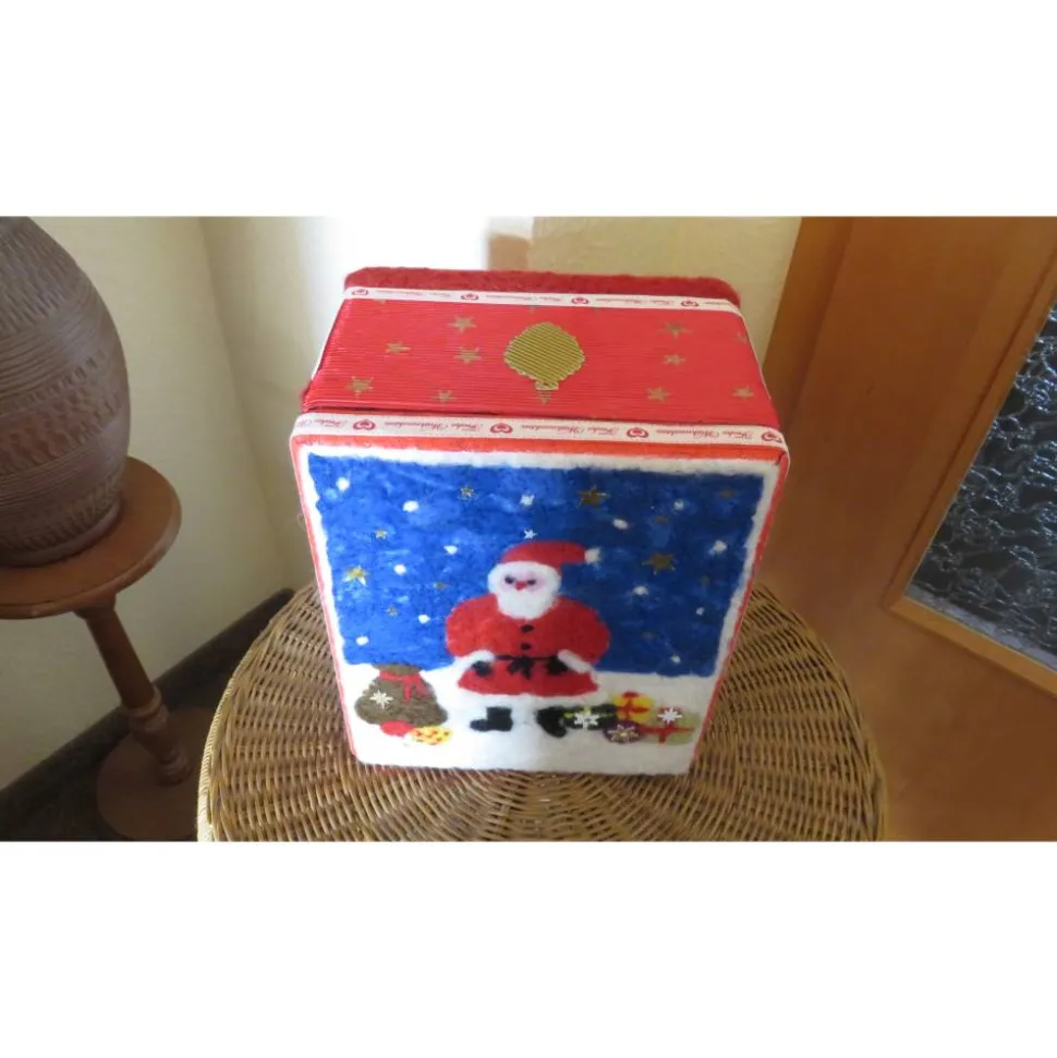 Die Schachtel habe ich mit Hilfe einer Filznadel und Filzwolle gestaltet. Nadelfilzen oder Trockenfilzen genannt. Außerdem wurde die Box mit Acrylfarbe gestrichen, mit Filzplatten, Wachstuch, und Wellpappe beklebt und verziert.