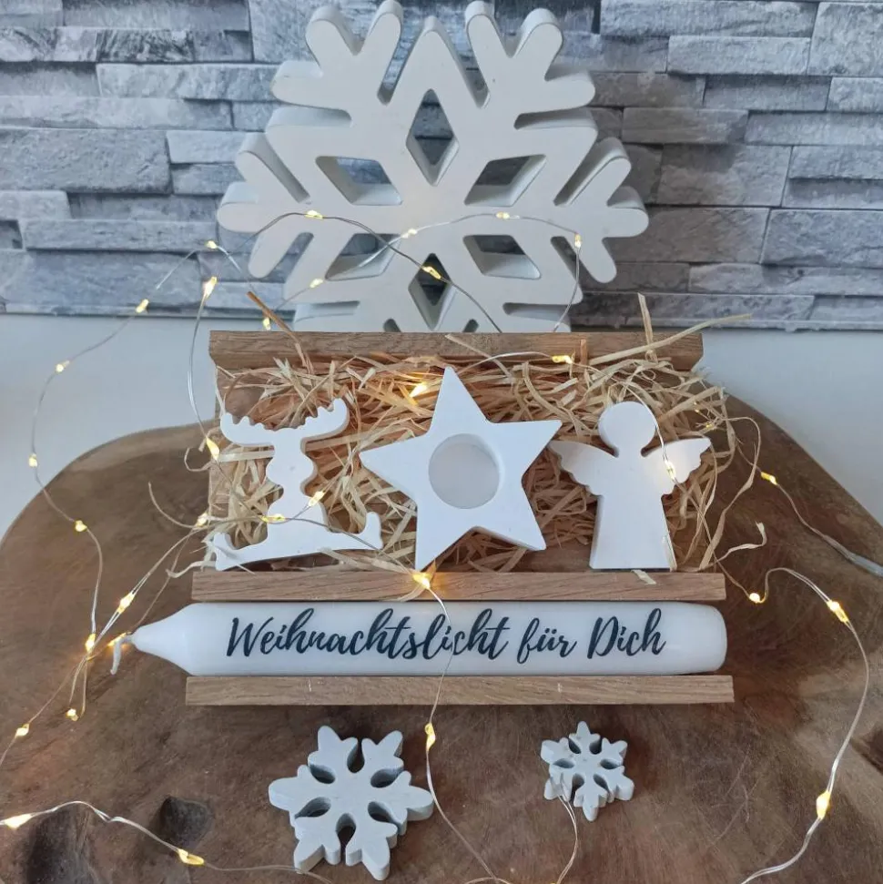 Dieses liebevoll gestaltete Kerzenset Weihnachten verzaubert mit einem Mix aus handgefertigten Deko-Elementen aus Raysin und einer dekorativen Kerze. Die Kerze trägt den Spruch „Weihnachtslicht für Dich“ und wird von einem stilvollen Stern-Kerzenhalter, einem Elch und einem Engel aus dem hochwertigen Material Raysin begleitet. Jedes Stück ist ein Unikat und mit Sorgfalt gefertigt, um die Magie der Weihnachtszeit bei dir einzufangen.