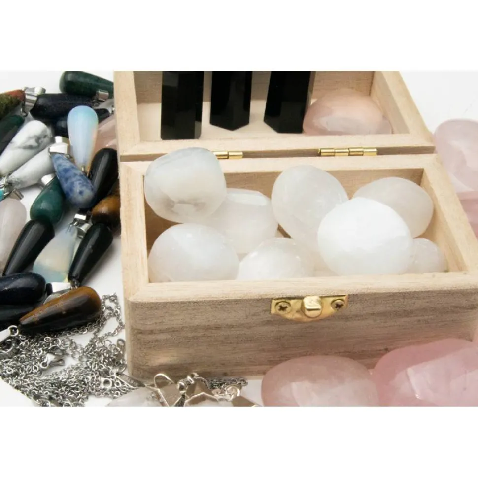 Wunderschöne kleine Box mit großem Inhalt, hier gibt es ein Rosenquarzherz, ein Selenit, ein Anhänger aus Bergkristall, einen Obsidianturm, tropfenförmige Anhänger (zufällig ausgewählt) und eine kleine Holzbox, einmal mit Zahnrädern (gegen Aufpreis) und wenn du diese noch kreativ gestalten möchtest, ohne beklebte Oberfläche.
