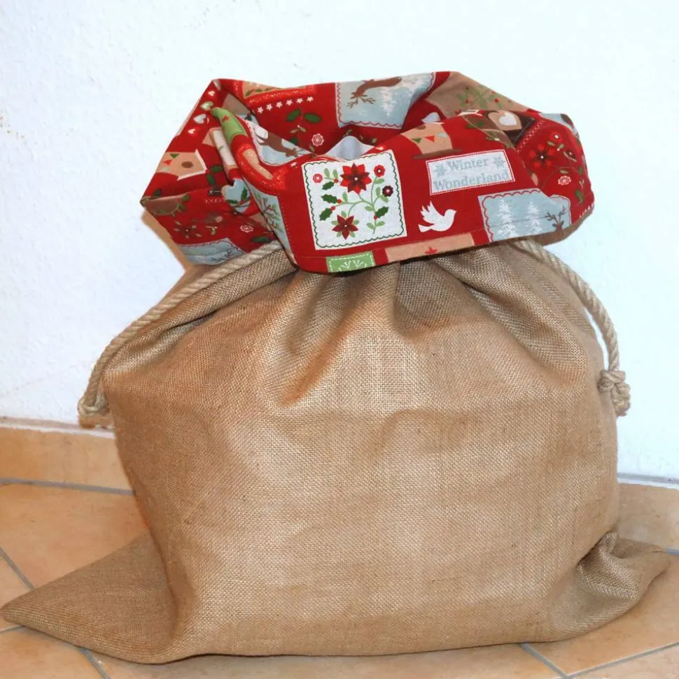 Der Sack besteht von außen aus typischen Rupfenstoff. Innen ist er komplett mit einem weihnachtlichen Baumwollstoff gefüttert und kann auch anders herum benutzt werden. Zum Binden wird eine Kordel mitgeliefert.