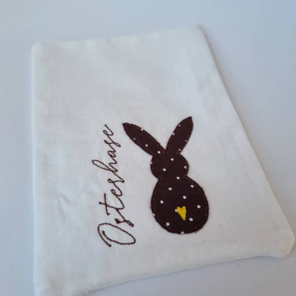 Es ist bestickt mit einem Häschen und der Aufschrift „Osterhase“ und wird mit einem dünnen Juteband – an dem noch ein passendes Label hängt – zugebunden.
