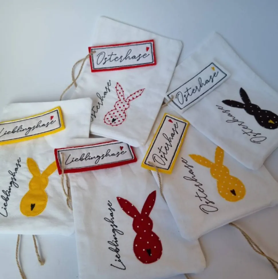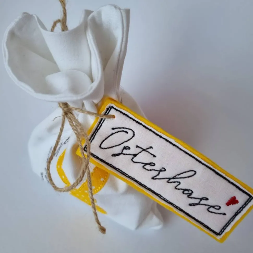 Es ist bestickt mit einem Häschen und der Aufschrift „Osterhase“ und wird mit einem dünnen Juteband – an dem noch ein passendes Label hängt – zugebunden.