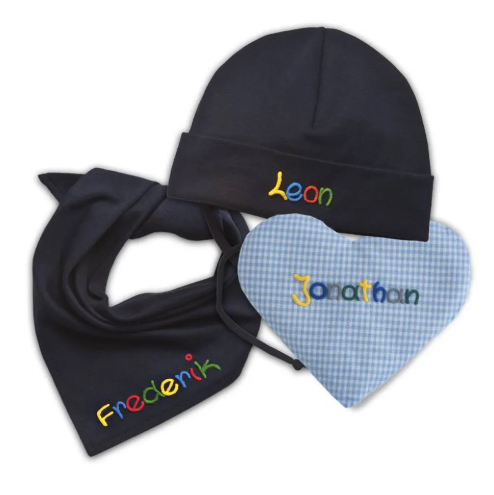 Tuch, Babymütze und Herz sind mit Namen beschriftet und liebevoll im Geschenkkarton verpackt, inklusive Glückwunschkarte. Das beliebte Set gibt es in zwei Farben.