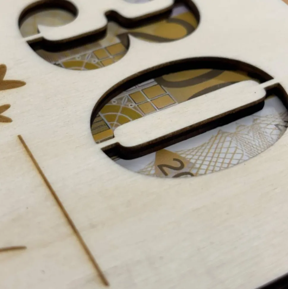 Die feine Gravur, die je nach Motiv teilweise durchgelasert ist, sorgt nicht nur für eine einzigartige Optik, sondern gibt auch den Blick auf das Innere frei – denn zwischen den beiden Holzplatten lassen sich Geldscheine, kleine Gutscheine oder liebe Botschaften platzieren. So wird aus einem einfachen Geldgeschenk eine persönliche, stilvolle und emotionale Geste.