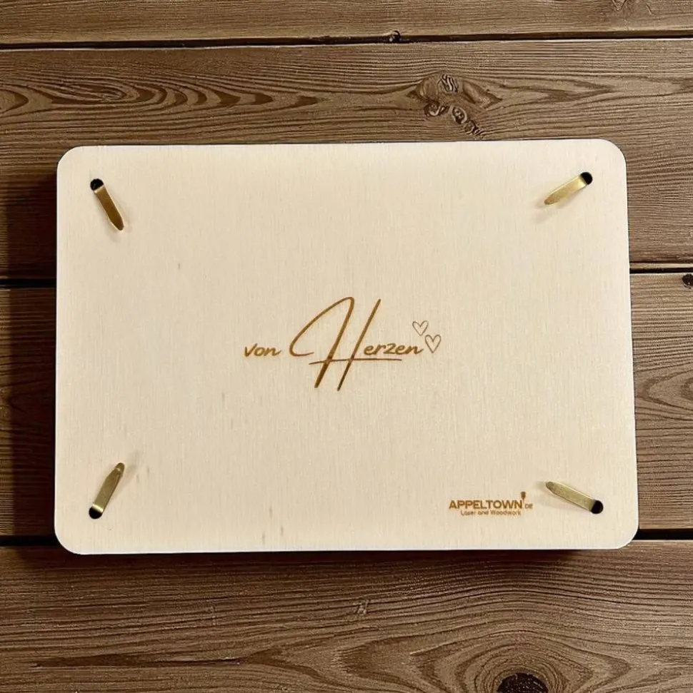 Die feine Gravur, die je nach Motiv teilweise durchgelasert ist, sorgt nicht nur für eine einzigartige Optik, sondern gibt auch den Blick auf das Innere frei – denn zwischen den beiden Holzplatten lassen sich Geldscheine, kleine Gutscheine oder liebe Botschaften platzieren. So wird aus einem einfachen Geldgeschenk eine persönliche, stilvolle und emotionale Geste.