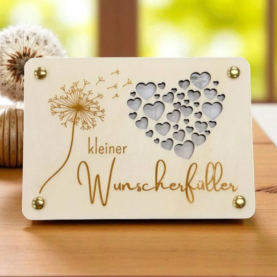 Die feine Gravur, die je nach Motiv teilweise durchgelasert ist, sorgt nicht nur für eine einzigartige Optik, sondern gibt auch den Blick auf das Innere frei – denn zwischen den beiden Holzplatten lassen sich Geldscheine, kleine Gutscheine oder liebe Botschaften platzieren. So wird aus einem einfachen Geldgeschenk eine persönliche, stilvolle und emotionale Geste.